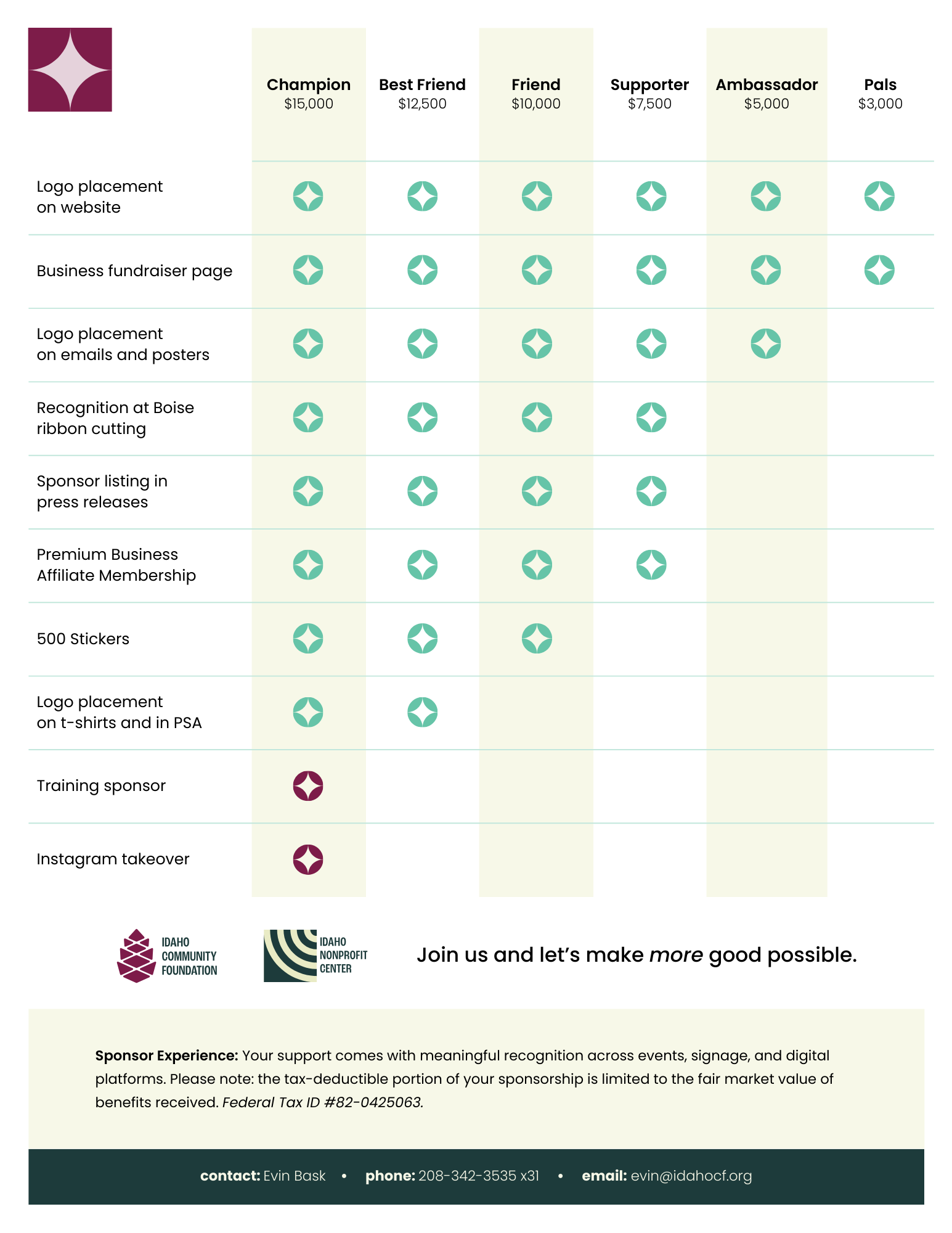 Email Evin Bask, evin@idahocf.org for more sponsorship information.